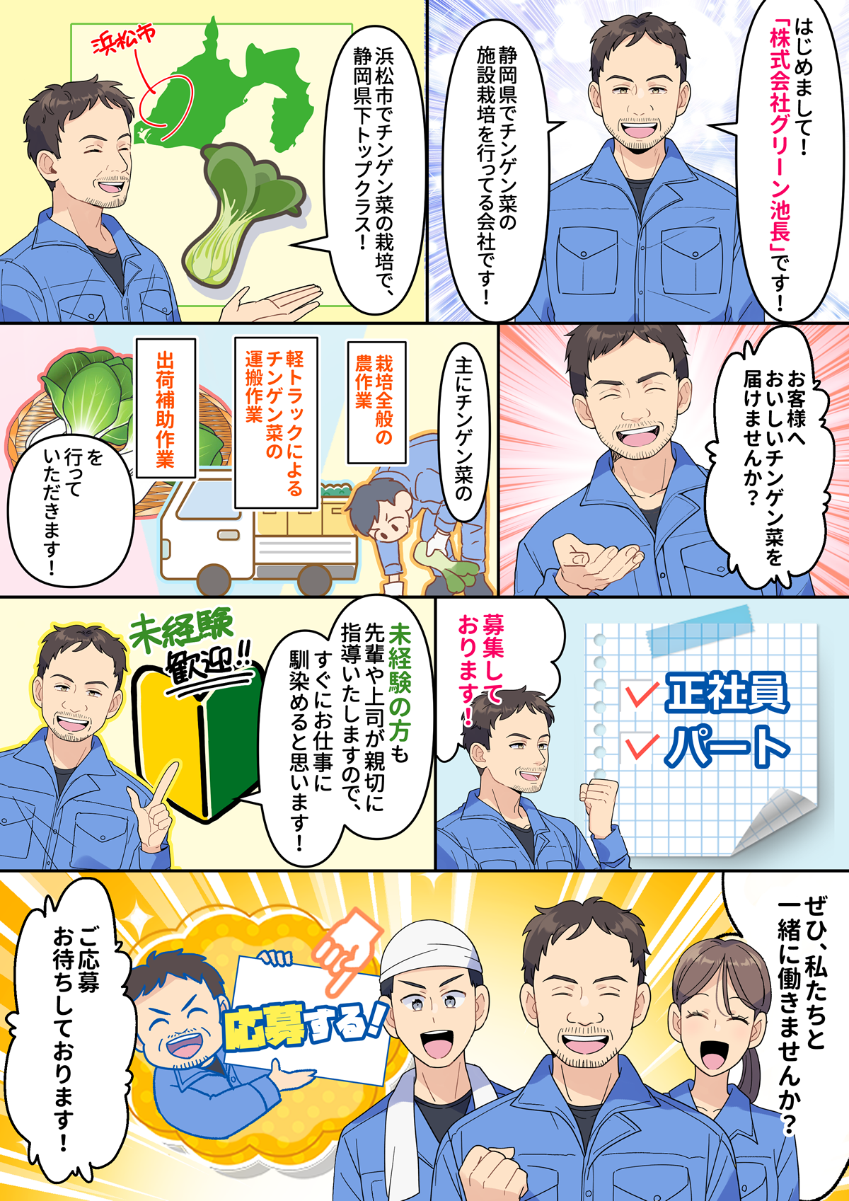 | 仕事内容 | チンゲン菜の施設栽培(チンゲン菜の栽培全般の農作業・軽トラックによるチンゲン菜の運搬作業・出荷補助作業) |